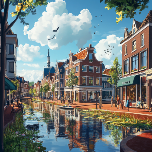 Show the identity of the city of Waddinxveen in the Netherlands in 2050 through the eyes of teens. The city will be more adjusted for teens and their needs so they can develop themselves. Art style