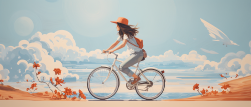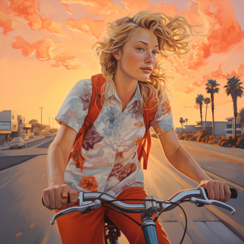a James Jean painting of a teenage cowgirl riding her bike down the Long Beach, California Bike-Path during sunset