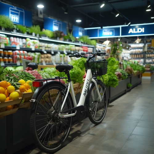 White E-Bike stands inside the "ALDI" store, ultra-realistic, ultra-high quality, 4k --s 250 --v 6.0