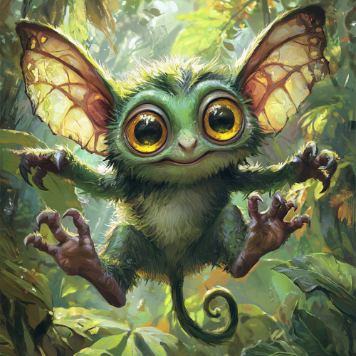 Small green creature with big yellow eyes, large bat ears, a monkey tail, and four arms, playful and agile, in a vibrant forest setting, illustration --s 250 --q 2