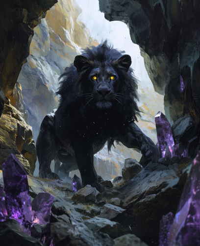 cinematic full body picture of a black lion, glowing yellow eyes, large purple crystals growing out of its back and arms, facing the camera in a moody cave landscape --ar 9:11 --v 6.0