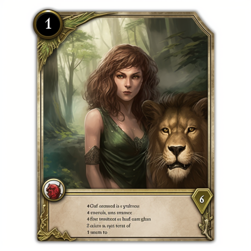 a magic card of a legendary creature half-human, the forest creature, head of princess and lion body, has dark hair with golden hair ends, honey eyes, ready to ride the pyrenees --v 5.0