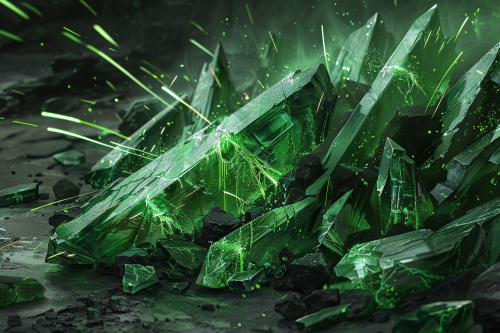 fantasy art, a table full of cracked green crystal, the crystals are glowing with harsh green glow, green sparks are arcing between the crystal shards, --ar 3:2