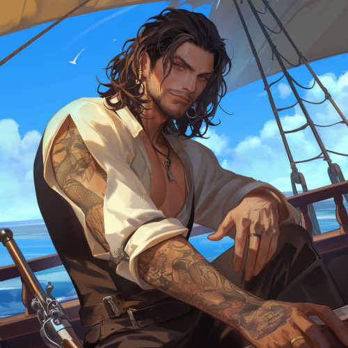 a handsome man, is a pirate captain, tan skin, scarred skin, dark eyes, dark hair, tattoos, wearing typical pirate clothing, pirate ship background, historical theme, historical setting --niji 6