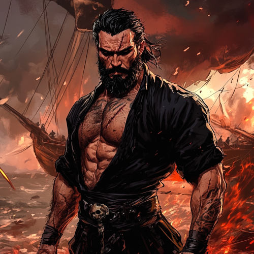 a muscular pirate captain, black pirate clothes, his biceps ripping the sleeves, tattoed, black beard, epic, pirate ship battle scene in the background, comicbook artstyle --v 6.1