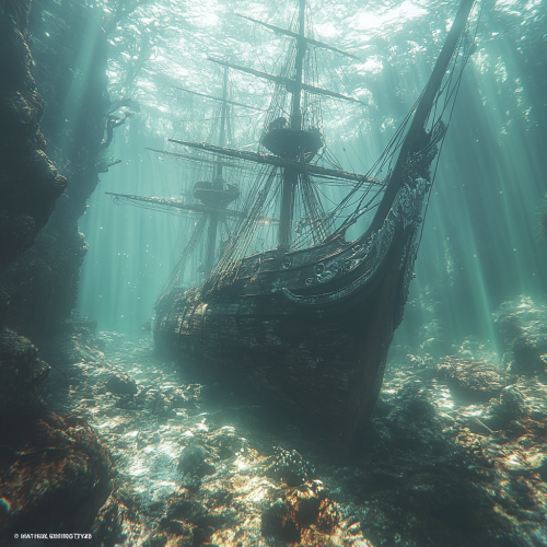 a shipwreck of a pirate frigate under the ocean, detailed, Depth of Field, Editorial Photography, UHD, HDR, HD, Natural Lighting, High Quality, Super - Resolution, Saturated Colors, Ray tracing Reflections, Cinematic, Unreal Engine 6.1, Highly Detailed, ultra-detailed, 8k, hdr, cinematic lighting, depth of field, Photorealistic, Highly Intricate Details, ultra high, ultra detail, Photorealistic, Cinematic, Highly Detailed, Camera Shots, Dramatic, Realistic, high quality, hd, Chromatic Aberration, GB Displacement, Scan Lines, Ray Traced, Ray Tracing Ambient Occlusion, Anti - Aliasing, FKAA, TXAA, RTX, SSAO, Shaders, OpenGL - Shaders, GLSL - Shaders, Post Processing, Post - Production, Cell Shading, Tone Mapping, CGI, VFX, SFX, insanely detailed and intricate, elegant, super detailed, dynamic pose, volumetric, intricate details, 8K, super detailed --v 6.1 --s 750