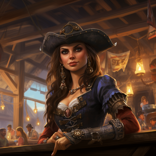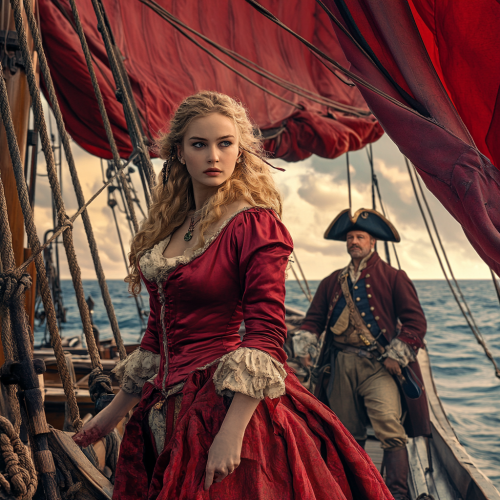 young lady dressed regarding fashion of beginning of 18 century is standing on the pirate sailing boat with scarlet sails. Near her is pirate captain. Film scene. Ultra realistic --v 6.1