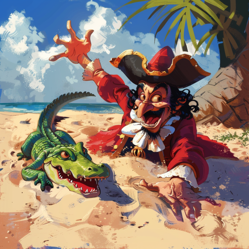 Disney style illustration of classic Disney character Captain Hook buried in the sand on a beach summer day with crocodile coming towards him in a t-shirt style design high quality image