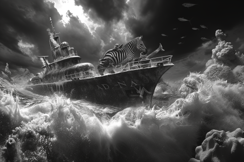 Cinematic submarine sketch black and white photographic dramatic seascape with a zebra, a fierce Captain Pirate, captured in Taika Waititi's style and Barry Idoine'snfrared with globules, captain pirat , RRNLI, masterpiece by Toshio Shibata ultraWide angle lens,in the style of sketch of milo marara-chaos 50 --ar 3:2 --v 6.0