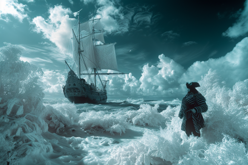 Cinematic photographic dramatic seascape with a Captain Zebra Pirate, captured on a lost island ,an infrared with the kraken , captain pirat , RRNLI, masterpiece by Toshio Shibata ultraWide angle lens,in the style of sketch of milo manara and the style of graeme base-chaos 50 --ar 3:2 --v 6.0