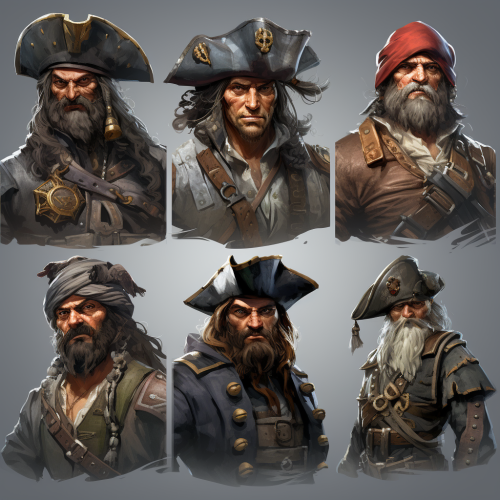 Create 10 pirate avatars of the same character, each evolving from the previous one as though the pirate has increased in level and experience. Begin with a basic, novice pirate and progressively enhance their appearance, gear, and demeanor to reflect their growth and development as they become a legendary pirate captain