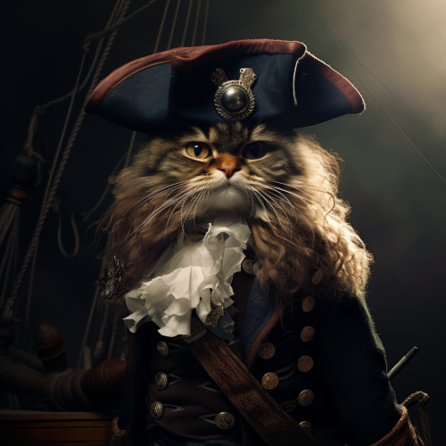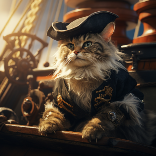 a fluffy cat on a pirate ship dressed as a captain with an eye patch
