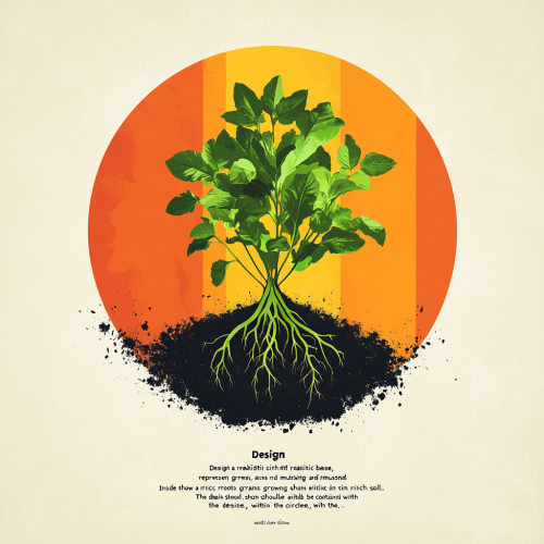 "Design a realistic circle icon that represents a nutrient-rich base, using dark green, orange, and mustard yellow. Inside the circle, show a realistic plant with strong roots growing in rich soil. The design should be contained within the circle, with the branding colors integrated into the icon." --s 250