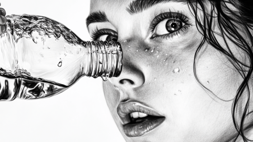 storyboard illustration extreme close up shot looking up at the mouth of a water bottle as a single drop falls towards camera and woman holds the bottle, concept art, storyboard, black and white, pencil drawing, --ar 16:9 --v 6.1