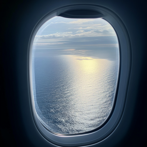 candid photograph taken with an iPhone 12 Pro Max, Portrait mode looking through a plane window of the sea below Image in the style of a posted image on Reddit in 2023. [when + where]. Depth of field. [orientation] style raw v6