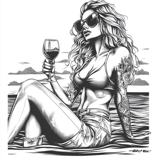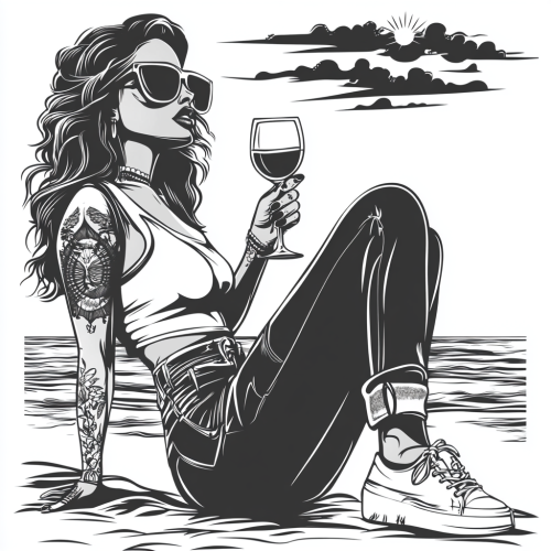 woman holding a glass of wine in her hand, has curls, stylish sunglasses, tattoos, a top and long jeans, sits and looks at the sea and the sunset, vector graphics, black and white, white background