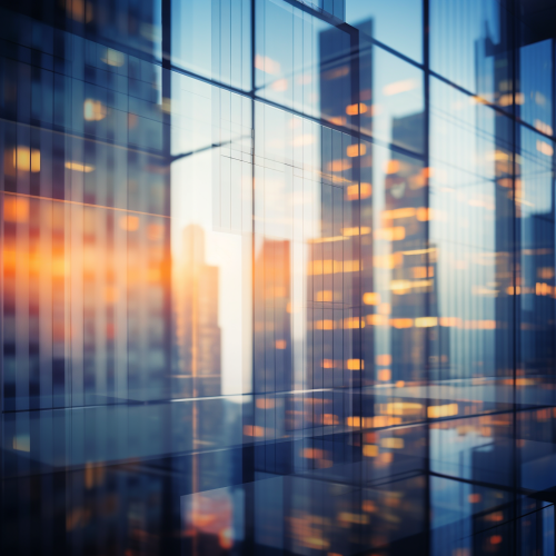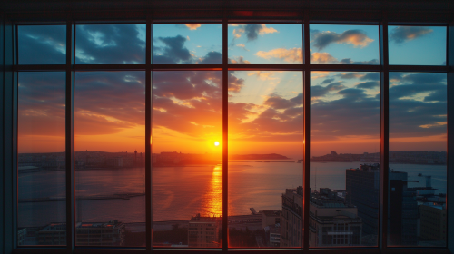City sea sunset godrays through window frames