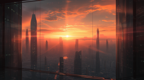When i looked out the window outside onto the futuristic sci-fi city, there was a sunset and godrays, photo with window frames --ar 16:9 --v 6.0 --style raw