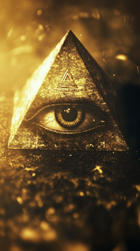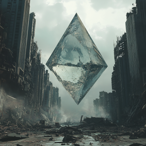 a giant crystal triangle floating amongst a ruined city that is destroyed and ruined to the ground it is a realistic cinematic shot the scene is grey with a bright contrast coming from the triangle floating above the city