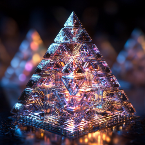 Generate a high-resolution image depicting a fractal structure inspired by the concept of 1.58 dimensions. The structure should resemble a Sierpiński triangle, showcasing self-similar, repeating triangular patterns. Visualize this fractal as a monolayer of bismuth atoms arranged on an indium antimonide substrate, highlighting the metallic sheen and atomic arrangement. The background should be dark to emphasize the intricate geometry, with subtle quantum effects like a faint glow around the edges to convey the material's unique properties