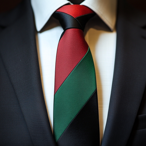 Design a necktie entirely covered by the flag design provided. The tie should feature a red triangle starting at the top near the knot, with the top half of the tie in green and the bottom half in black, following the exact layout of the flag. The design should flow seamlessly down the length of the tie, ensuring the colors--red, green, and black--are bold and vibrant. The tie should have a sleek and elegant appearance, perfect for both formal and professional settings, while making a striking statement with its unique flag-inspired pattern.