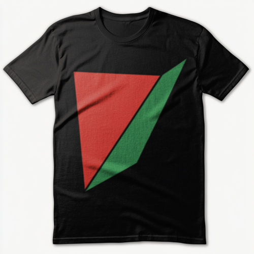 Design a t-shirt featuring a unique flag with a large red triangle on the left side, a green top section, and a black bottom section, exactly matching the image provided. The flag should cover the majority of the front of the t-shirt, centered and bold. Ensure the red, green, and black colors are sharp and vibrant, and the flag’s triangular shape is clear and striking. The t-shirt should come in neutral tones like black, white, or grey to emphasize the flag's design.
