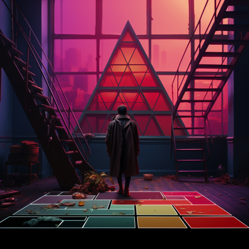a hyper real still life photograph of a white cylinder tube is sitting on a black triangle pedestal. the background has a geometric pattern that is bright yellow, medium yellow, black. the lighting is bright and sunny. --ar 16:9 --v 5.0 --s 750
