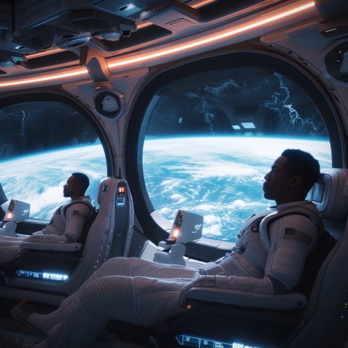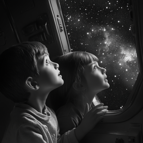 modern surrealist film, black and white, a 7 year old boy and girl press their face up to the window of a spaceship so they can get a better look at the stars