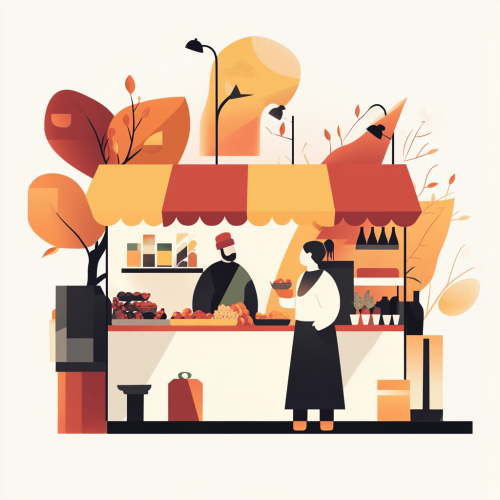 a minimalist geometric design style using autumn colors. Design elements that are associated with the fall equinox. The cartoon design should be diverse vendors at a night market --v 6.1