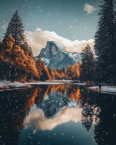 Yosemite National Park, the iconic Half Dome mountain covered in snow with autumn-colored trees on both sides of the river, snowflakes falling from the sky, the reflection of the trees and mountains in the water, beautiful clouds, a couple walking along the river bank, captured with a wide-angle lens, in the golden hour light, an award-winning photograph, in high resolution, shot with a Sony A7 Ill. --ar 51:64