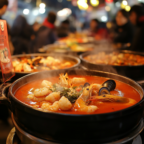 Create a lively autumn festival scene set on Gunsan Jjamppong Street, lined with colorful stalls and banners celebrating the spicy and savory flavors of jjamppong. Show people gathered in warm clothing, enjoying steaming bowls of vibrant red jjamppong, with rich seafood ingredients like shrimp, mussels, and vegetables in a flavorful broth. The atmosphere should feel cozy and warm, with a slight chill in the air and fall leaves scattered around. Capture the joy of visitors as they savor each bite, with traditional Korean lanterns and lights adding a festive touch to the background.