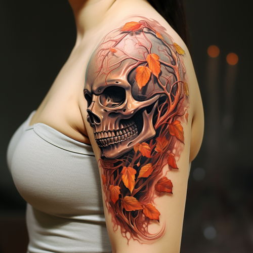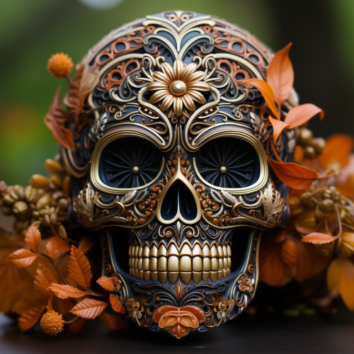 intricate biomechanical day of the dead skull design bronze, silver, oranges, beige, black and with fall leaves in an autumn background --s 750