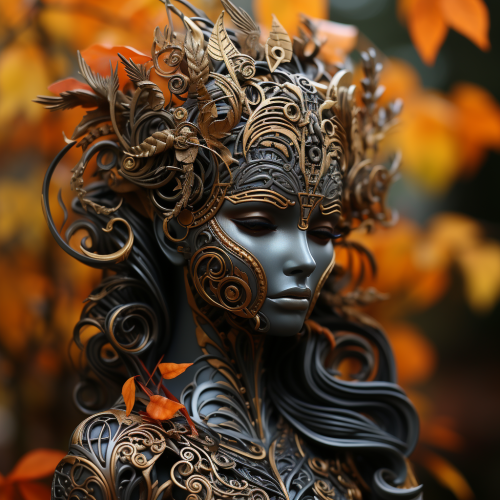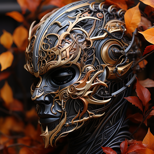 intricate biomechanical night elf design bronze, silver, oranges, beige, black and with fall leaves in an autumn background --s 750