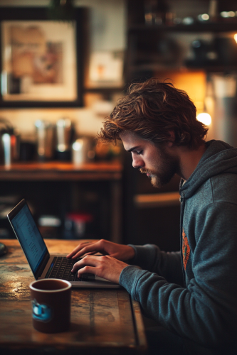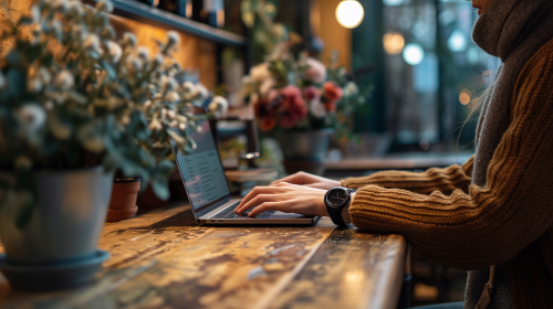In a charming coffee shop, a woman in her forties sits at a wooden table, her hands gracefully typing on a laptop keyboard. Her wrist, adorned with a sleek black watch, adds a touch of elegance to her ensemble. The image captures the back of her hands, creating a visual at a 45-degree angle with the camera. Her hair frames the edges of the image, adding a sense of privacy and focus to the scene. The laptop on the table has a blank white screen. The composition highlights the emptiness of the computer screen, suggesting a moment of reflection or contemplation. The background features the ambiance of the coffee shop, with snow season. Shot by a professional photographer using a Nikon Z8 camera, the focus is on the hands gracefully typing on a laptop keyboard. --v 6.0 --style raw --ar 16:9