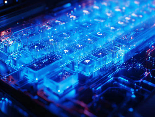 Close-up of a blue, glowing keyboard on a laptop computer with neon lighting. This high-resolution photograph was captured using a Canon R6 camera with an f/8 aperture setting and an ISO of 400, striking a balance between detail and clarity. --ar 4:3 --s 250