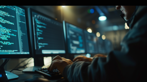 A close-up of a hacker in a dark office, typing fast, multiple computer screens lighting up the space. Left side: hacker’s hands on the keyboard, right side: detailed code filling the screen. Deep shadows, soft computer light, modern tech design, high contrast lighting, hd quality, cinematic mood, photorealistic --ar 16:9 --v 6.0