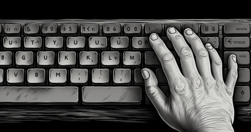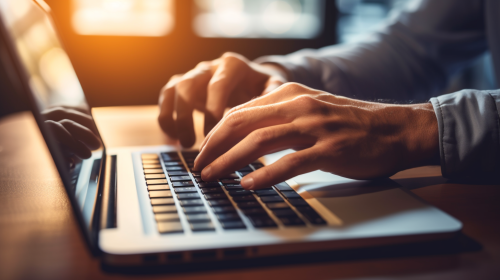 Photorealistic close-up of hands typing on a laptop keyboard, with floating digital icons representing security, quality control, time management, and global connectivity. The icons, including a checkmark, padlock, clock, globe, and people, are holographic and glow softly, interacting with the hands on the keyboard. The scene should feel modern, clean, and technologically advanced, as if captured in a real-world setting with sharp focus on the hands and digital elements. --ar 3:2 --v 6.1