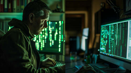 A detailed image of a hacker at night in a shadowy office, typing on a keyboard. Left side: hacker’s focused face lit by the monitor’s glow, right side: a screen filled with green code and terminal windows. Dim light from computer screens, dark corners, high contrast lighting, sharp shadows, ultra-realistic tech setup, hd quality --ar 16:9 --v 6.0