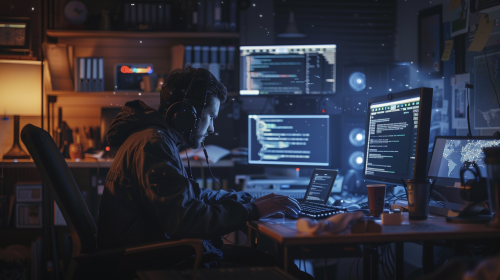 A cinematic shot of a hacker sitting in a dark office, typing rapidly on a mechanical keyboard, illuminated by the light from multiple monitors. Split-screen effect: left side shows the hacker at work, right side shows the computer screen with complex hacking scripts. Ambient light creates a moody atmosphere, strong contrast between light and dark, modern tech design, sharp details, photorealistic --ar 16:9 --v 6.0