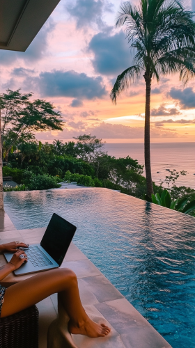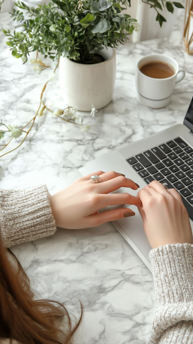 Woman's hands typing on laptop, ring and bracelet visible, marble desk surface, coffee cup nearby, indoor plant, natural window lighting, professional photography, shallow depth of field --ar 9:16 --style raw --s 250