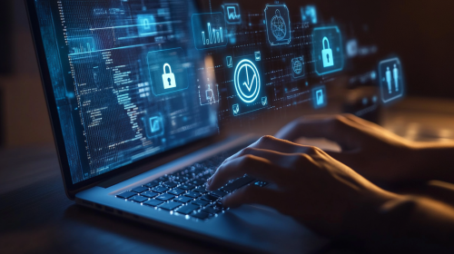 Create a photorealistic image of a person typing on a laptop keyboard with various digital icons floating above the screen, including a lock symbol, checkmark, globe, and group of people. The scene should convey themes of data security, quality assurance, and connectivity. The setting is a clean, modern workspace with natural lighting, focusing on the hands and the digital interface. The icons should be semi-transparent and appear as if they are part of an augmented reality display. --ar 16:9 --v 6.1