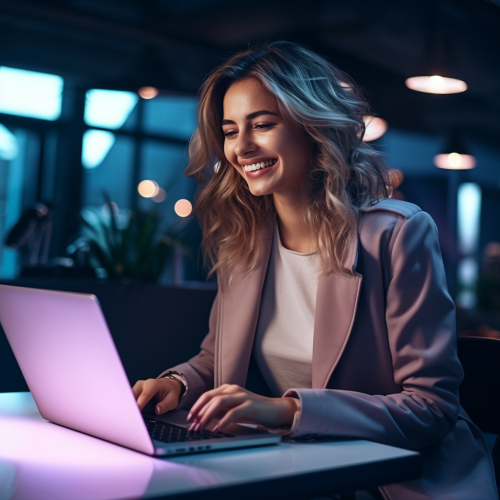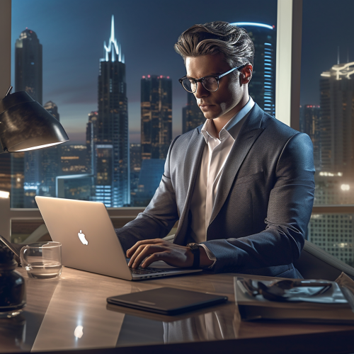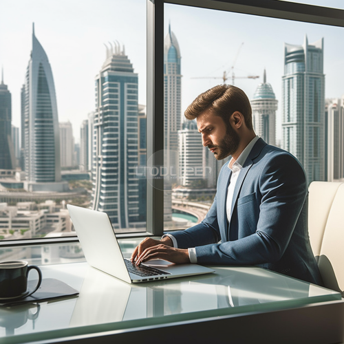 Ultra-realistic photo of a real estate agent character typing on a laptop at a sleek modern desk. The agent has a confident expression, wearing professional yet stylish attire, with subtle modern office decor and Dubai skyscrapers visible in the background. The scene uses realistic lighting, textures, and skin tones. Reflection of the glowing laptop screen on the agent’s glasses. Busy professional office environment, minimal but elegant background, high detail on character and laptop --v 5.1 --ar 1:1 --seed 999