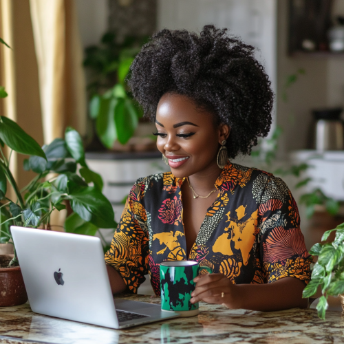 beautiful african american woman with african printed top typing on laptop with coffee mug with african map on it in glam big kitchen with green plants