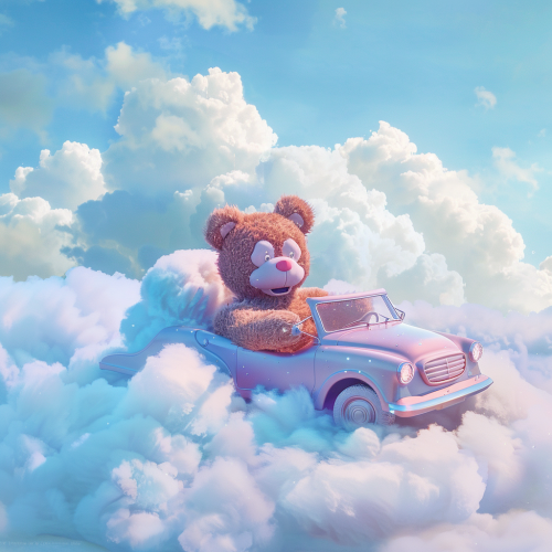 photo real image of Care Bear as a real bear. driving a cloud car.