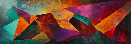 A dynamic, modern abstract painting that combines sharp geometric shapes with bold, vibrant colors like electric teal, burnt orange, and deep magenta. The design should have an energetic, almost chaotic flow, with angular lines intersecting and forming unexpected patterns. Incorporate contrasting textures smooth, glossy areas next to rough, matte sections to create depth and intrigue. The piece should convey movement and excitement, capturing the feeling of urban life and modern innovation, with hints of neon lighting and abstract cityscapes --ar 3:1