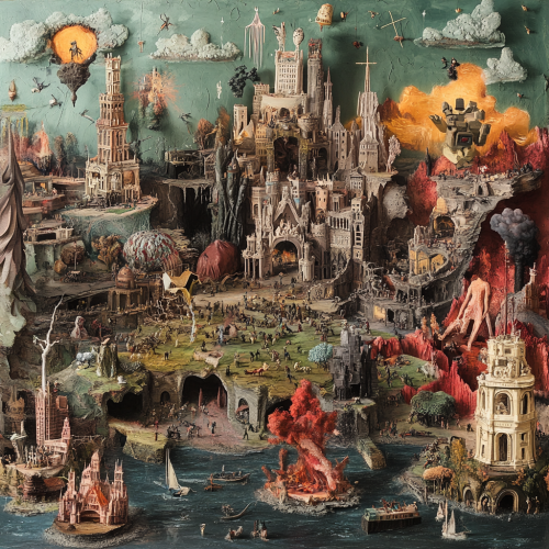 A detailed collage inspired by The Garden of Earthly Delights by Hieronymus Bosch, depicting a chaotic future world. The scene includes overpopulated cities with aging citizens, intense natural disasters, and barren landscapes caused by 2°C global warming. In one area, resources are scarce, leading to conflicts, urbanization, and refugee crises. Nearby, AI-powered machines and digital economies dominate, causing widespread job loss and inequality. The image is full of symbolism, with intricate details illustrating each issue, blending both dystopian and surreal elements in a vibrant, otherworldly setting. The color palette should be rich and varied, evoking both beauty and catastrophe in a complex, interconnected world.