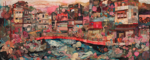 A multi-layered collage of fabric and paper, depicting an urban landscape with flowing waterways, surrounded by colorful floral patterns and whimsical creatures. The focus is on the materials, layered composition, and pink hues. --ar 82:33 --v 5.0 --s 750