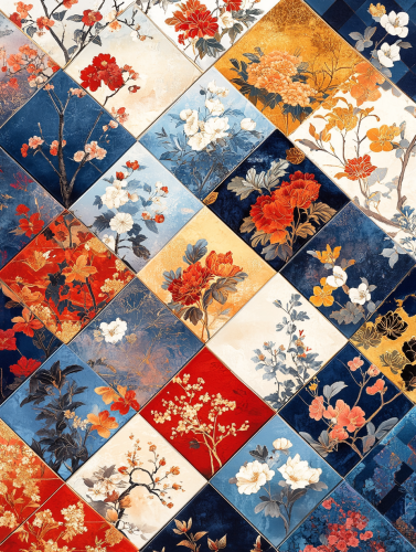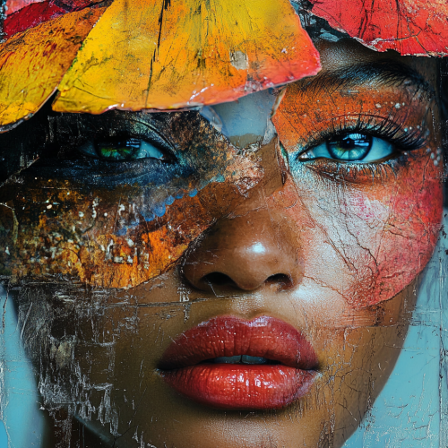 Collage of patterns and textures, urban life symbolism, vibrant colors