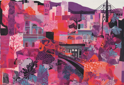 A multi-layered collage of various patterns and textures, including floral designs in shades of pink and purple, abstract geometric shapes, and silhouettes of buildings or figures. The background is filled with swirling lines that suggest movement and energy. In the center, there's an outline of San Francisco made from fabric, surrounded by multiple layers of colorful fabrics. This artwork symbolizes urban life through its vibrant colors and dynamic composition. --ar 41:28 --v 5.0 --s 750