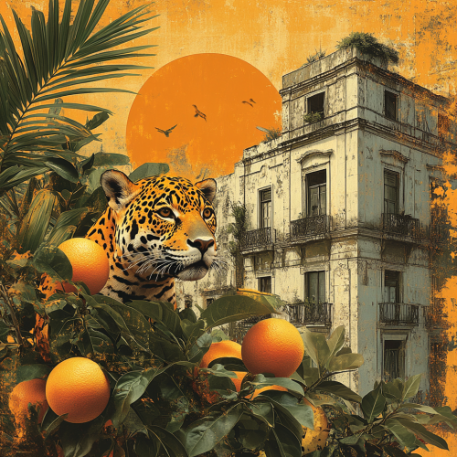 The essence of Mango Beats is the mix of tropical and urban elements, as our sound proposal is a blend of Brazilian vibes and hip-hop. Thus, we need both worlds interacting in the artwork. For this, we envision collages of buildings, urban art, tropical plants/fruits, and Brazilian animals (jaguars, parrots, capybaras, etc.). In our art proposal, we aim to mix warm colors (orange palette), symbolizing the tropical, and cool colors (gray palette), representing the urban. --s 750 --v 6.1